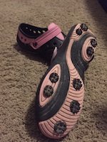 I usually love to wear golf sandals. While looking for sandals online I found they were priced in the $125 range. While looking I ran into a golf shoe called DAWGS. They are Croc-like shoes with golf spikes. I wore them without socks, but many of the reviewers stated they wore them with socks for cooler temps. They come in many fun colors and all my golfing gals just love them! I loved the price - only $29! I might be looking for a different color for next season. They are very comfortable and fit true to size. I ordered mine on Amazon.
